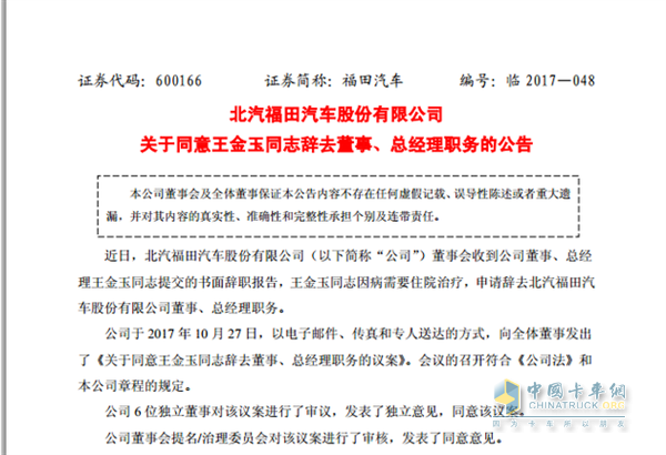 发布公告称,公司董事会收到公司董事、总经理王金玉同志提交的书面辞职报告,王金玉同志因病需要住院治疗,申请辞去北汽福田汽车股份有限公司董事、总经理职务,经表决同意王金玉辞去北汽福田董事、总经理职务。
