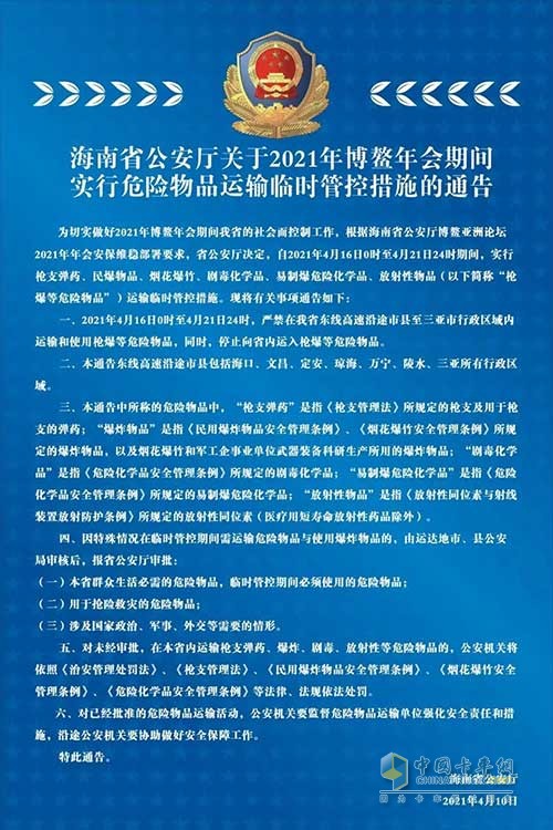 为切实做好2021年博鳌年会期间的社会面控制工作,根据海南省公安厅博鳌亚洲论坛2021年年会安保维稳部署要求,省公安厅决定,自2021年4月16日0时至4月21日24时期间,实行枪支弹药、民爆物品、烟花爆竹、剧毒化学品、易制爆危险化学品、放射性物品(以下简称“枪爆等危险物品”)运输临时管控措施。现将有关事项通告如下: