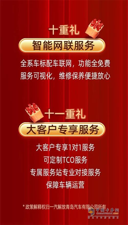 卡友运营有两大致胜“法宝”,车辆可靠+服务暖心,一汽解放青汽质量可靠早已有目共睹。11项服务“大招”启动,让卡友再无后顾之忧。