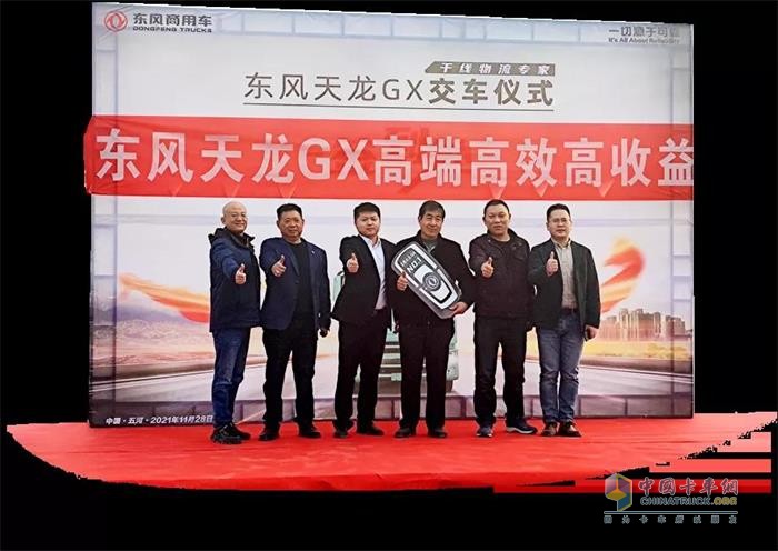 2021年11月28日,安徽五河县5台高端重卡东风天龙GX顺利交付XJD物流有限公司,30余家物流公司客户亲临现场,深度品鉴东风天龙GX的独特魅力。