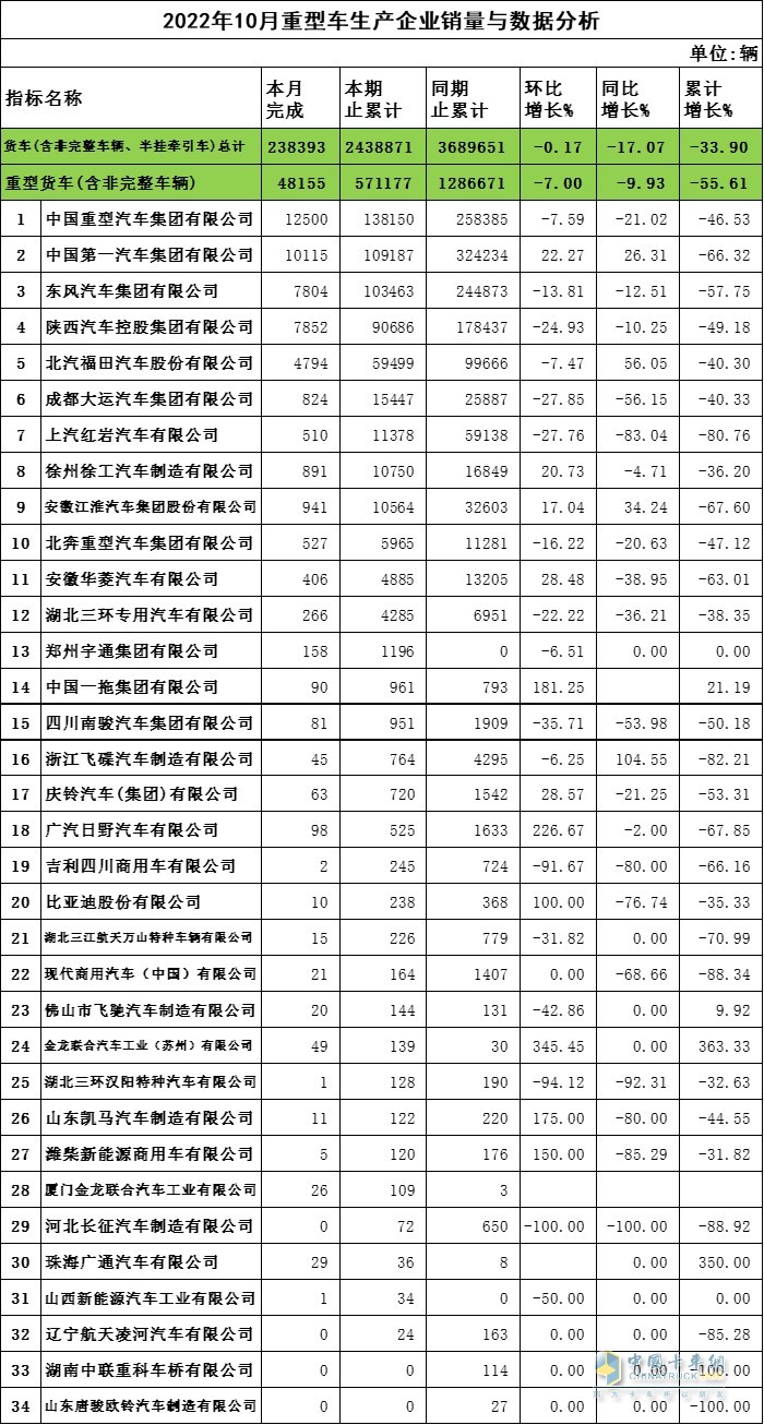 2022年10月重卡企业销量与数据分析